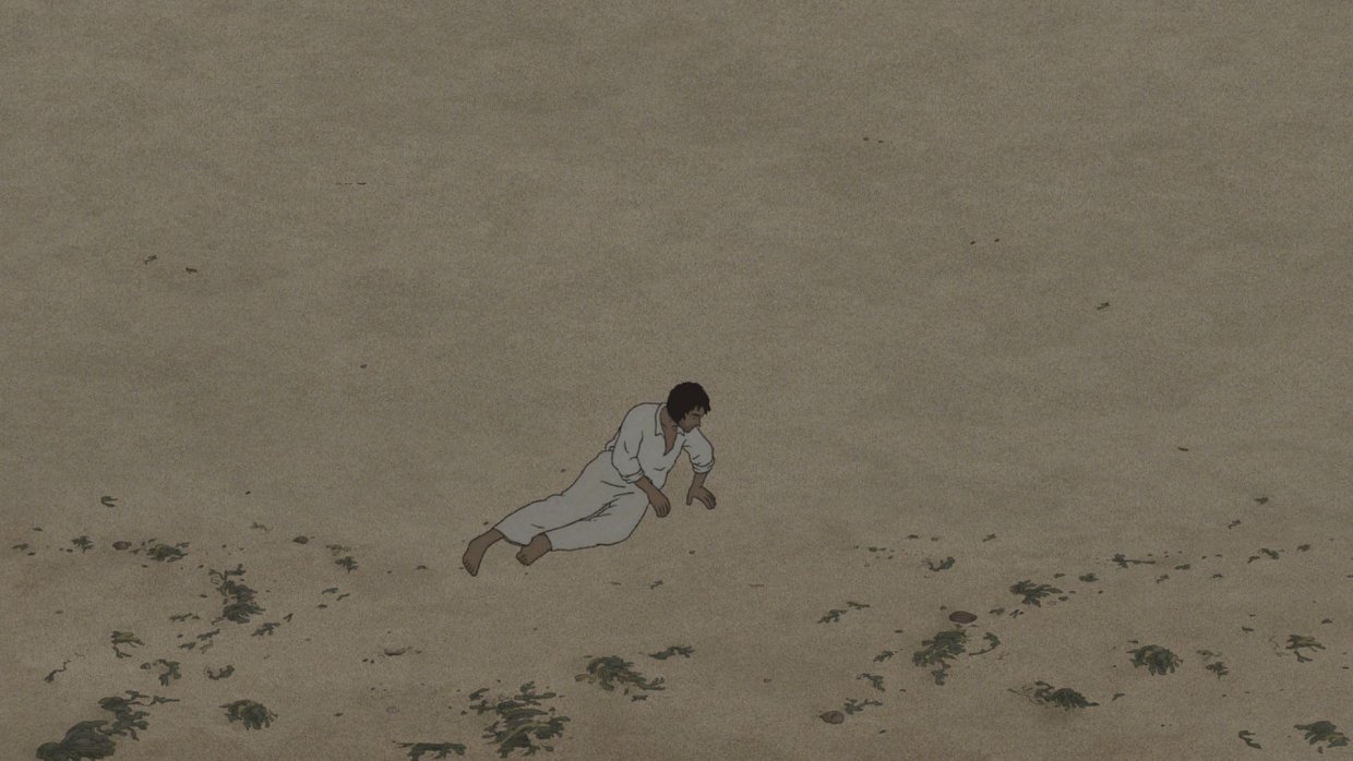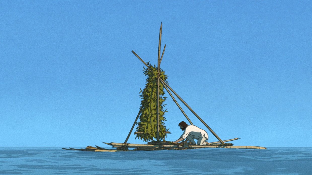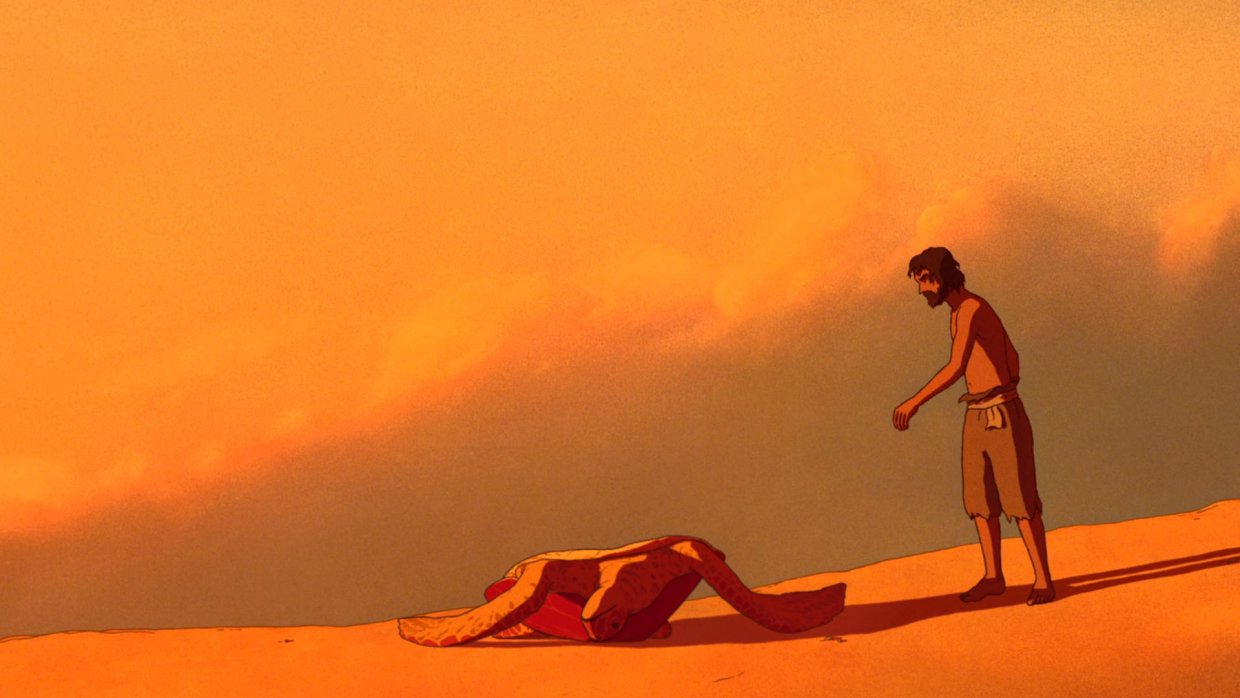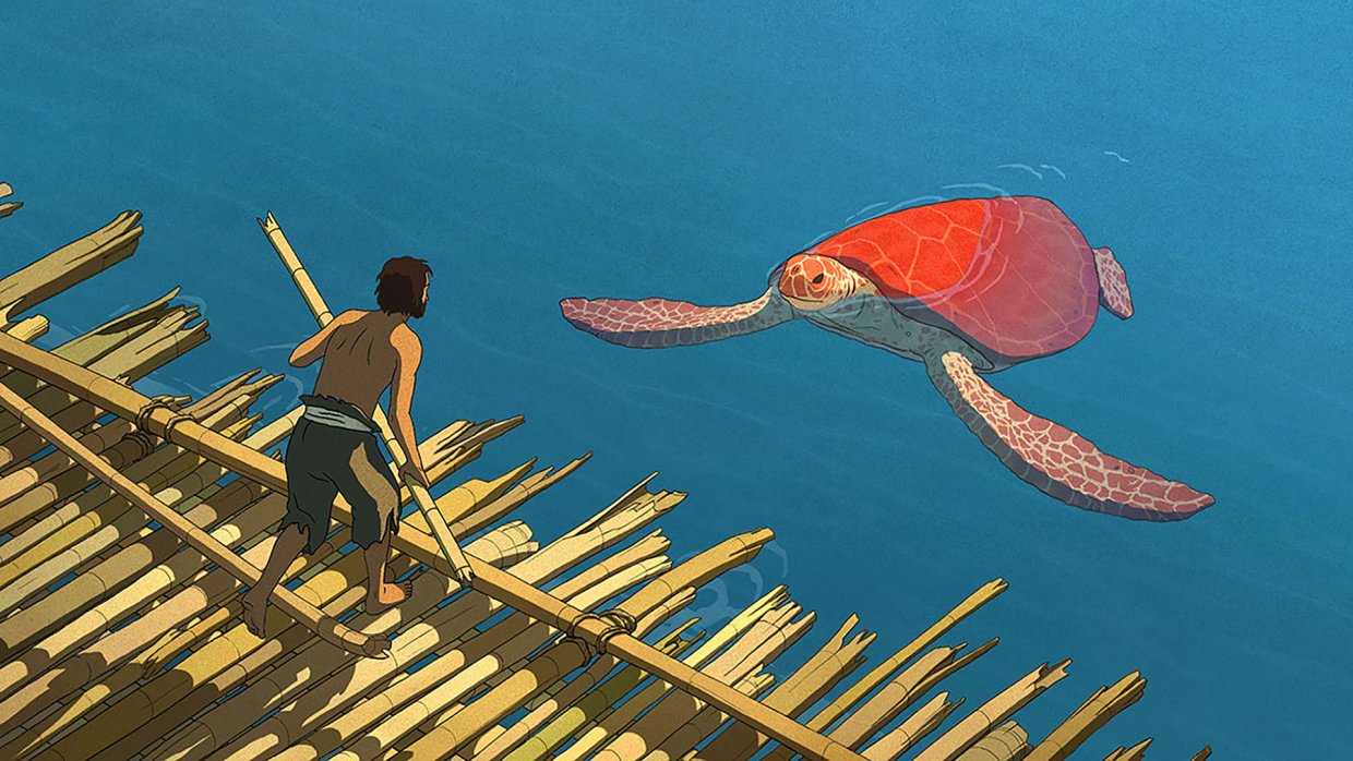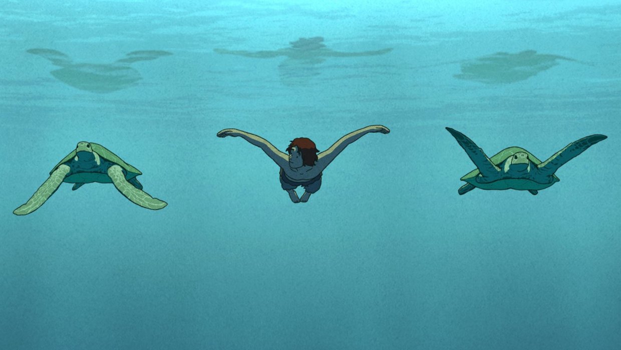 Мужчина попадает на необитаемый остров. Ему удаётся построить плот, но далеко уплыть не получается - красная черепаха пресекает все его попытки к бегству.